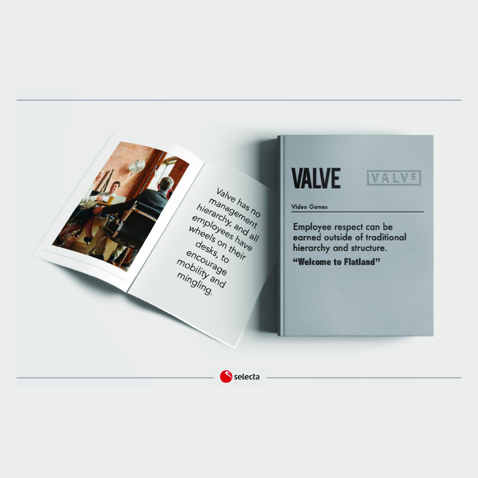 Valve’s corporate hierarchy is reflected in the credits of their games, with names simply listed alphabetically. Employees are encouraged not to fill a specific role, but instead to focus on getting products to launch to the highest quality possible. Their tongue-in-cheek handbook includes diagrams explaining how to communicate, including: “Talk to someone in the kitchen”.
